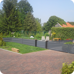 Deze afscherming is geplaatst op de betegeling rond het zwembad. Alle palen zijn voorzien van supplementaire beton onder het terras zonder schade aan de bestaande betegeling. Let op de afwerking van de betegeling rond de wegneembare tussenpaaltjes.