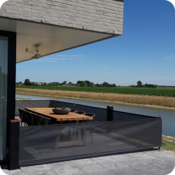 In de vakantiewijk de grooteduynen.eu wordt onze installatie gebruikt om het terras af te schermen, zodat de onbezonnen kinderen niet direct tot bij het water kunnen.